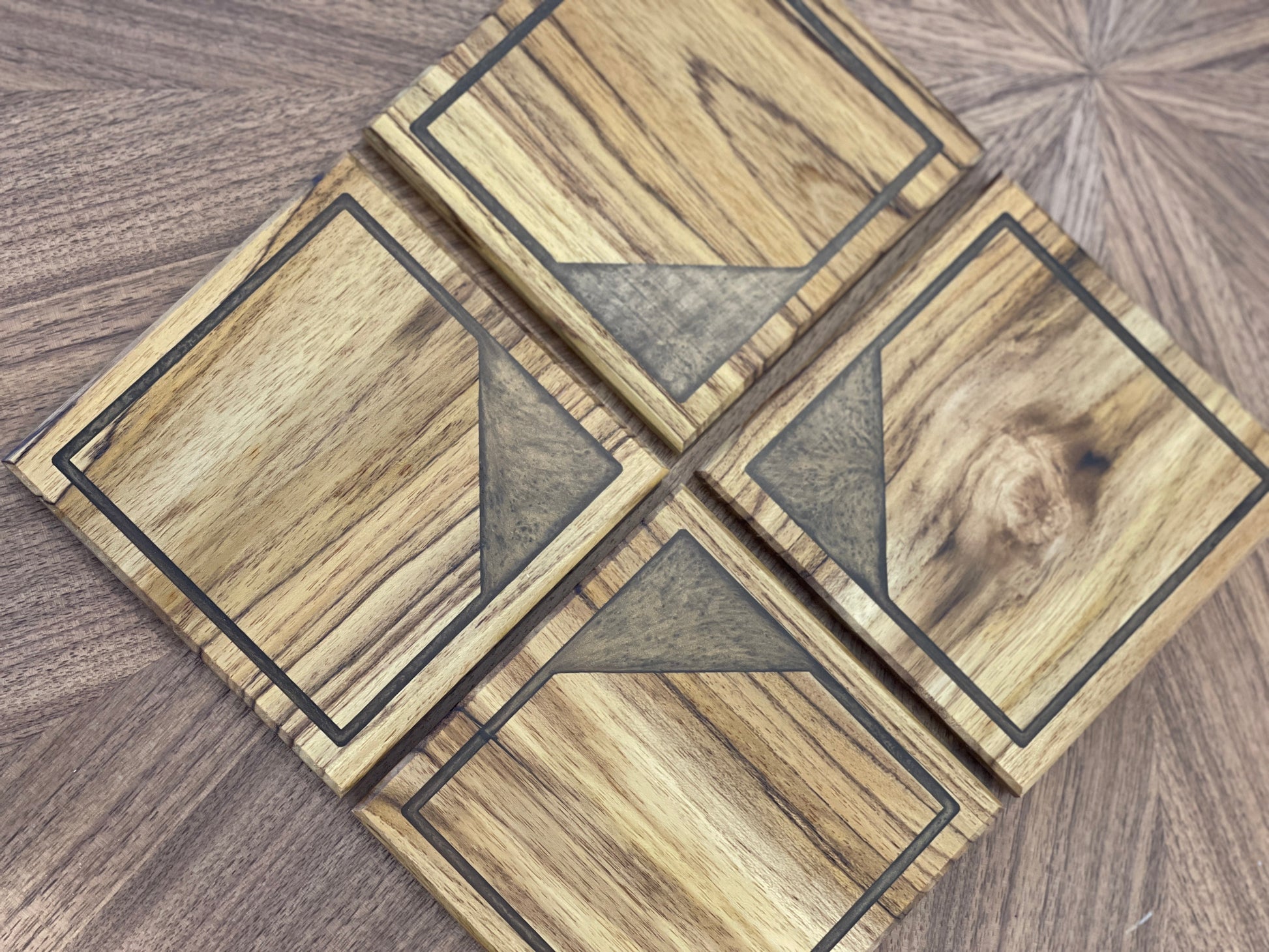 Handcrafted coasters made from exotic teak wood with a bronze copper epoxy. All coasters have an epoxy inlay, cut using a CNC router. Each coaster has cork on the bottom for anti slip and to protect your surfaces. Set includes 4 coasters, all finished with lacquer.