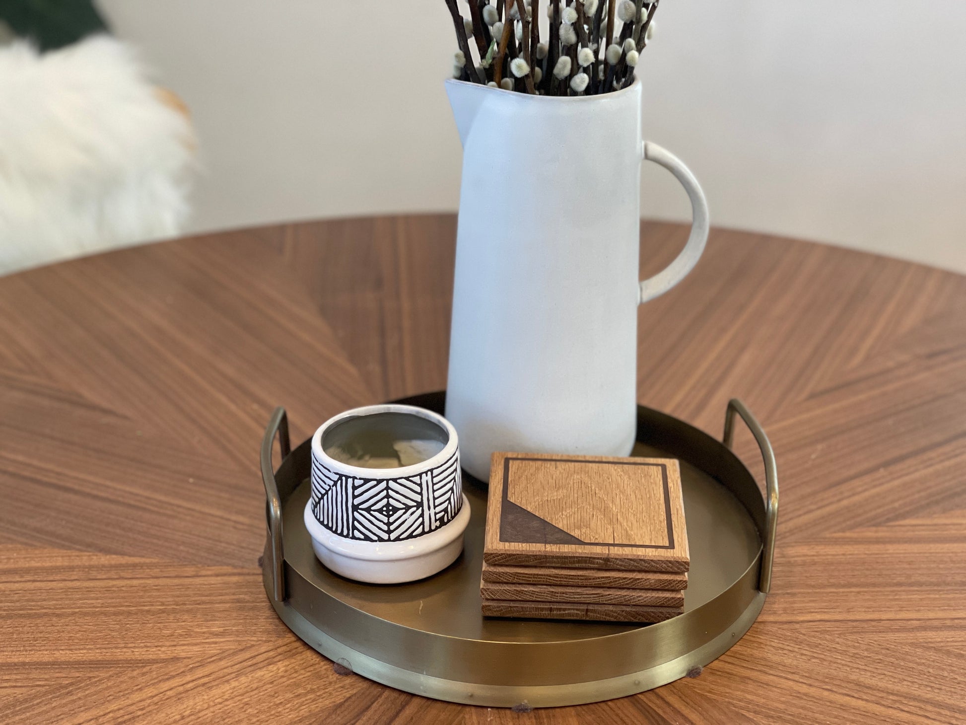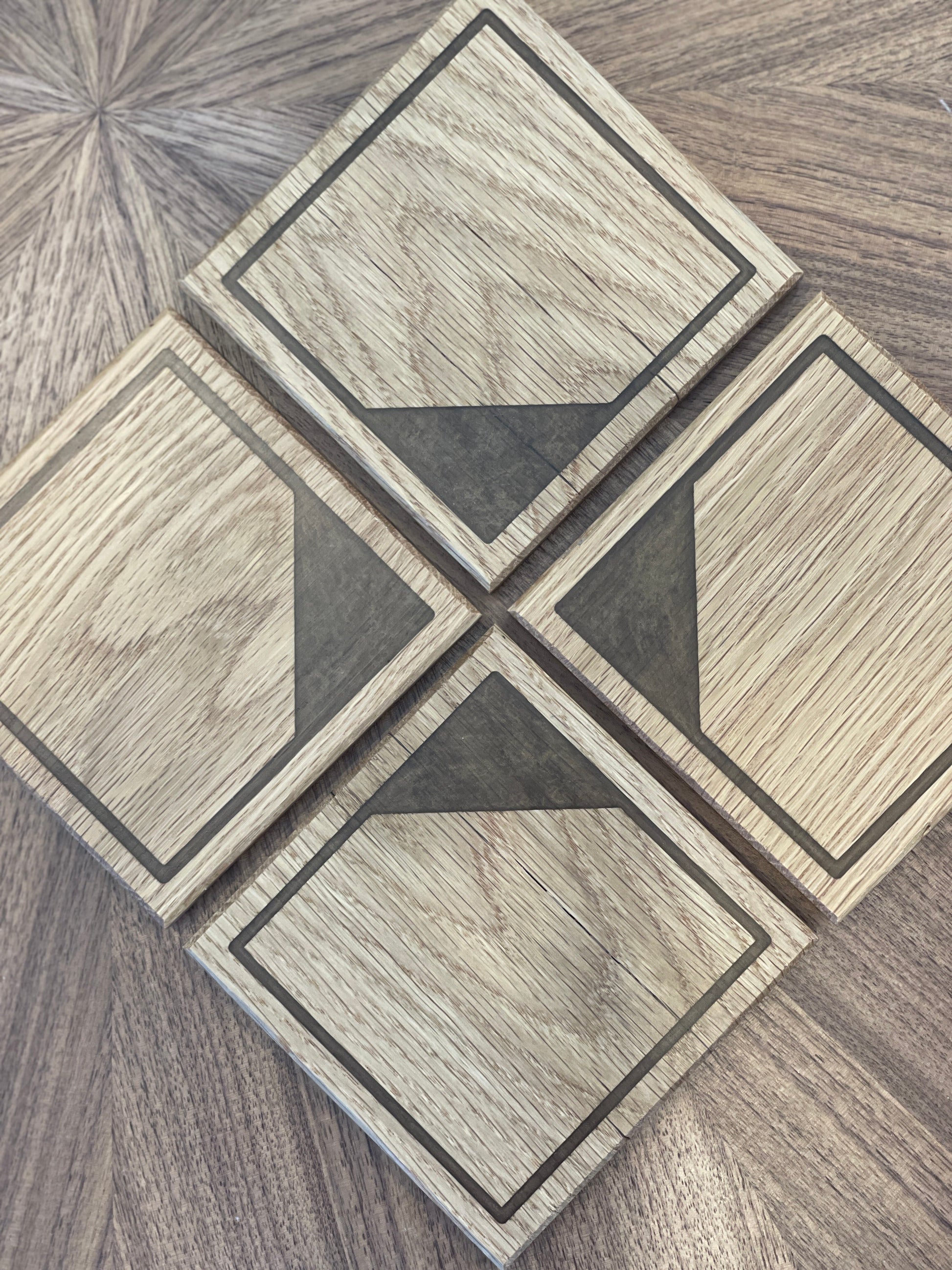 Handcrafted coasters made from white oak wood with a bronze copper epoxy. All coasters have an epoxy inlay, cut using a CNC router. Each coaster has cork on the bottom for anti slip and to protect your surfaces. Set includes 6 coasters, all finished with lacquer.